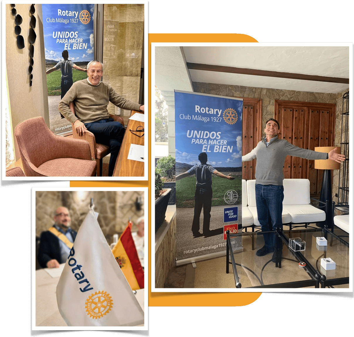 Pancarta azul con el logotipo del Rotary y la frase 'Unidos para hacer el bien'.