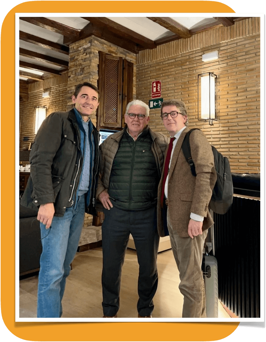 Reunión de varias personas en una sala de conferencias, sentadas alrededor de una mesa con documentos y bebidas, en un entorno con paredes de piedra y fotografías enmarcadas.
